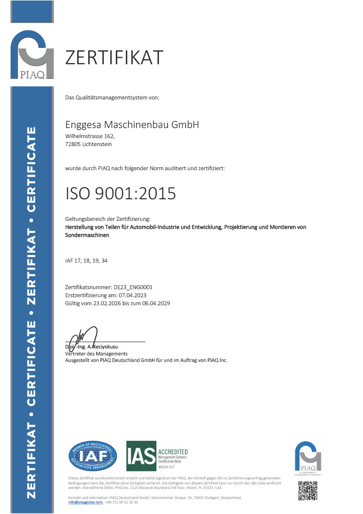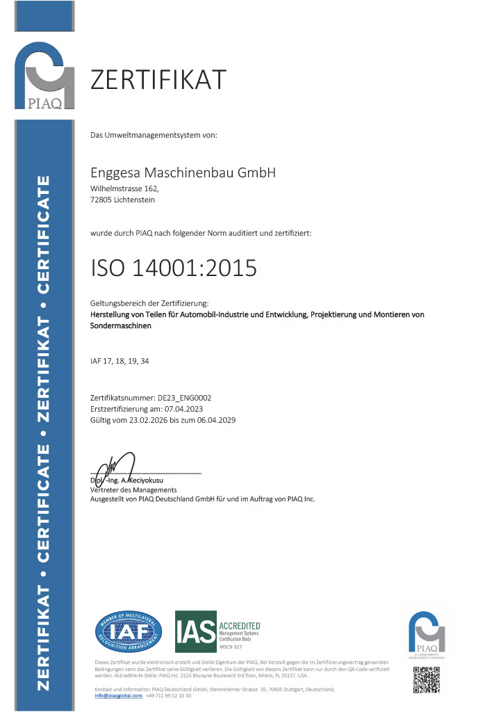 Zertifizierung Seit April 2023 ist das Qualitätsmanagementsystem der ENGGESA Maschinenbau GmbH nach den internationalen Normen ISO 9001 und ISO 14001 zertifiziert. Hier finden Sie die geltenden Zertifikate zum Download (PDF).